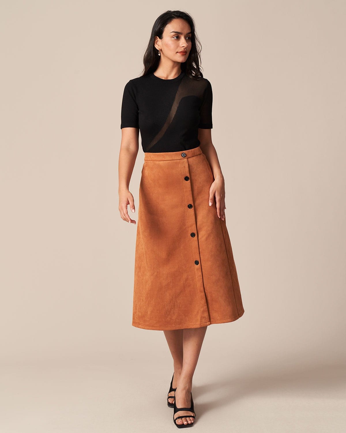 The Brown Single Breasted Suede Midi Skirt